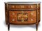 Commode a mezza luna con doppio cassetto centrale senza traversa e mezzo cassetto superiore. Due sportelli laterali. Piano superiore in marmo bianco di Carrara. In legno di amaranto, legno di rosa e legni di frutto. Decorazioni in bronzo dorato.