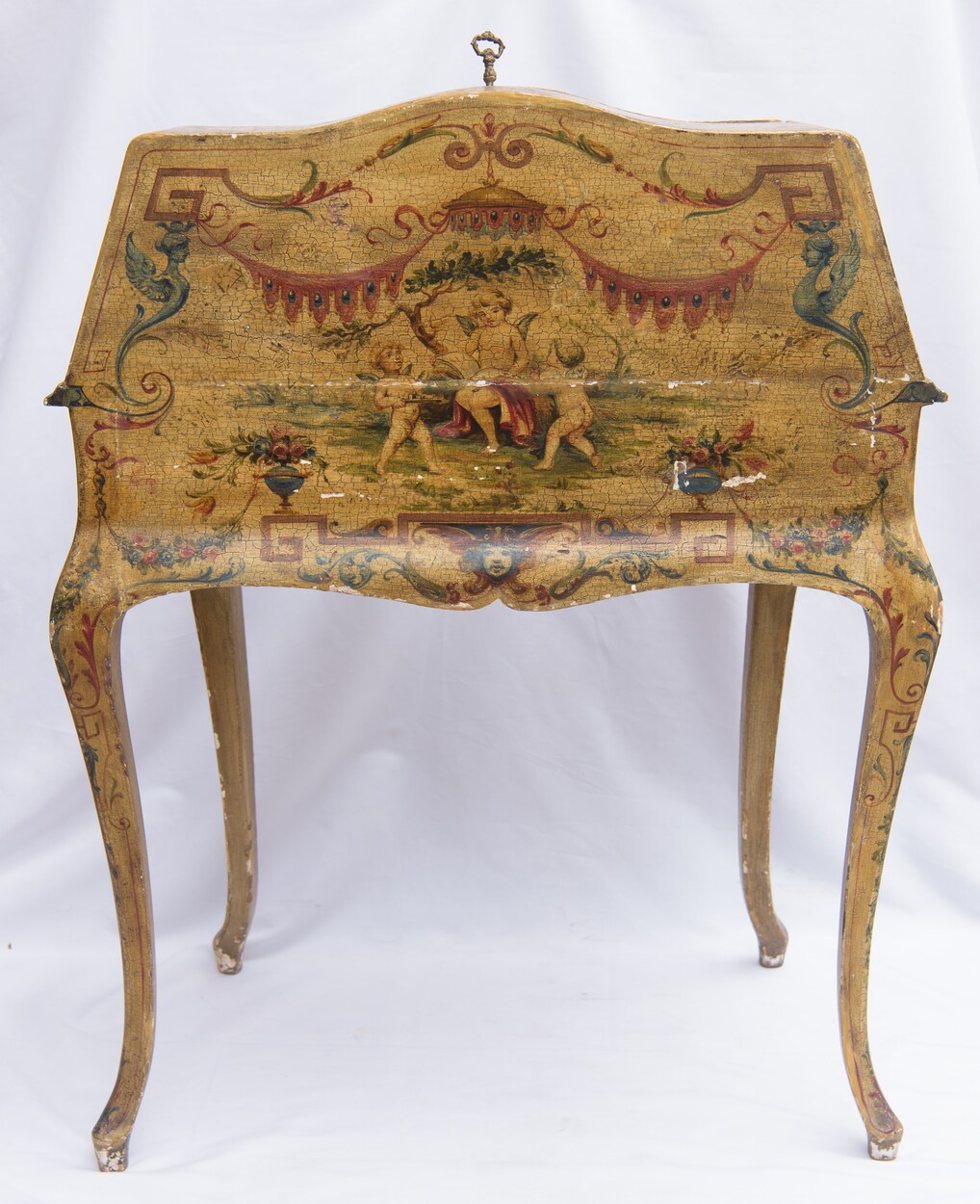 in legno laccato e decorato a ghirlande, scomparti interni a giorno e cassetti inferiori, gambe mosse. Stile Luigi XV