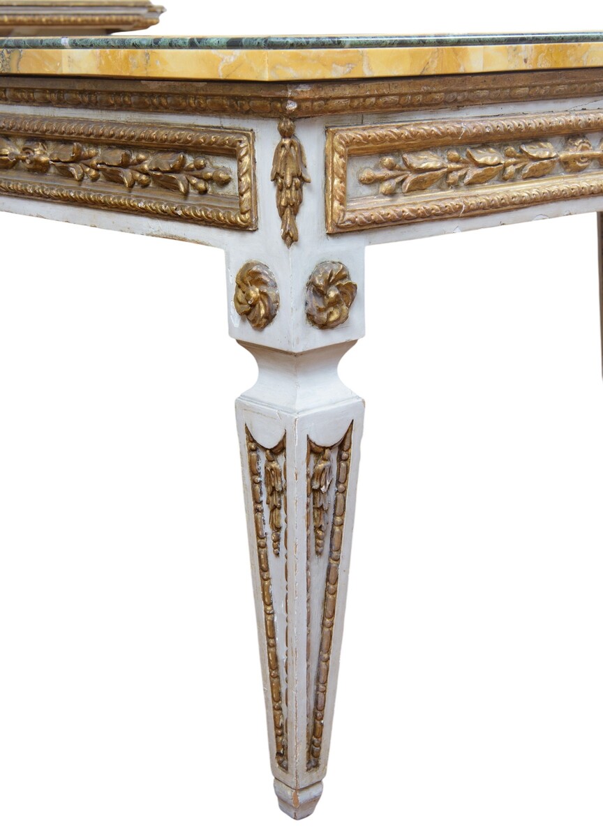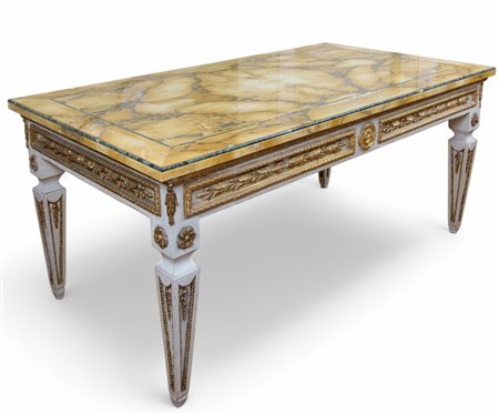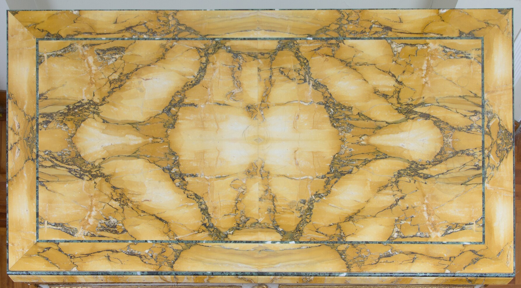 Con piano in marmo giallo broccatello di Siena lastronato su travertino, fascia decorata e dorata a foglie d'acanto. Quattro piedi e rastremato.