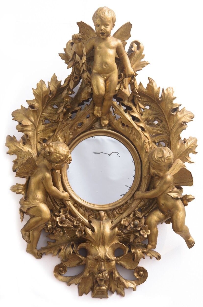 Specchiera di forma circolare riccamente intagliata. con mascherone alla base e tre putti alati a sorreggere il corpo centrale. Manifattura italiana, fine del XVIII secolo.