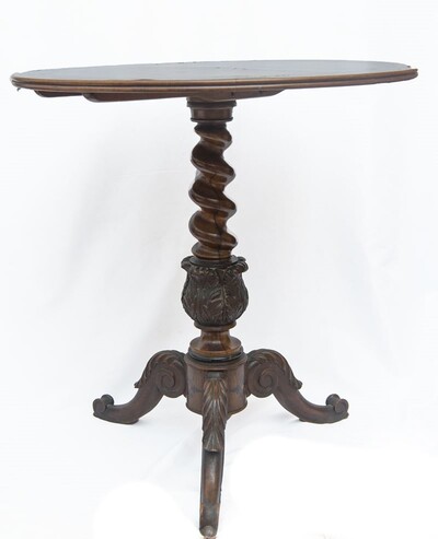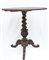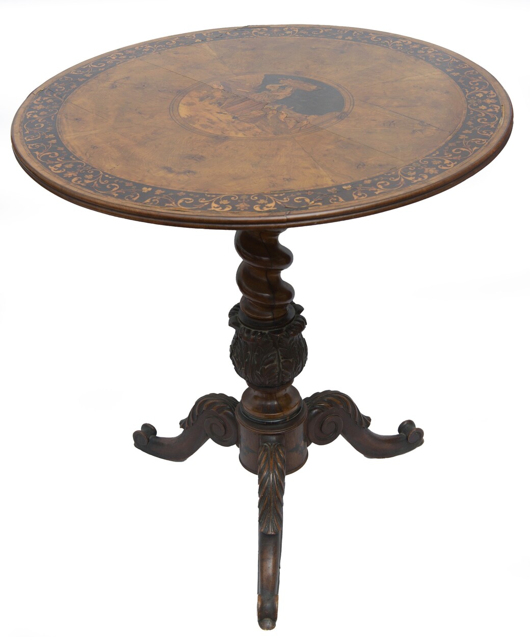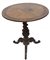 Tavolino di forma circolare, con basamento a tre piedi. in legno di noce intagliato. Piano superiore con intarsio centrale e bordo ornamentale intarsiato in legni vari a motivi floreali. Manifattura Sorrento, metà XIX secolo. Restauri al piano.