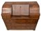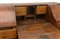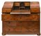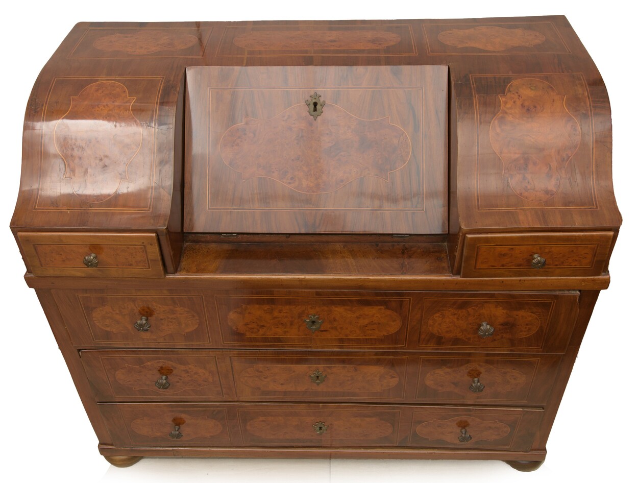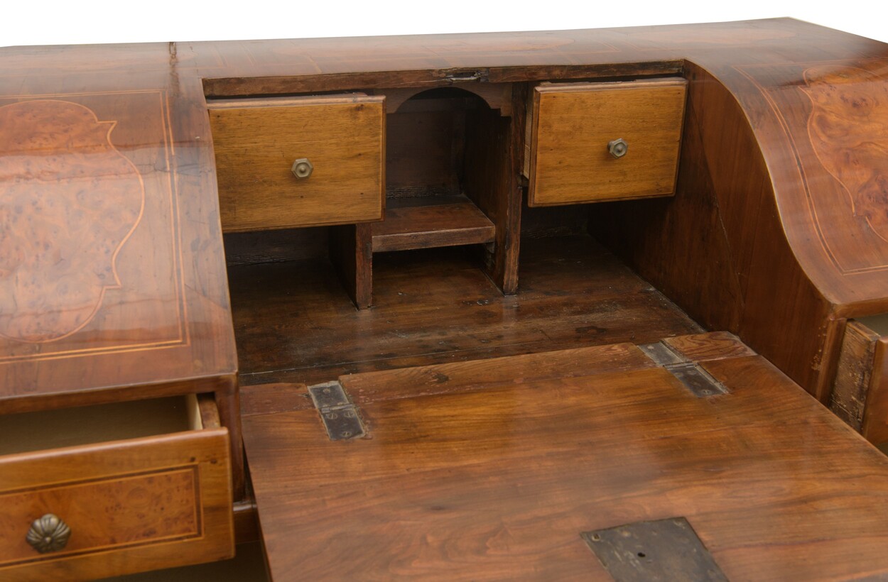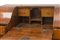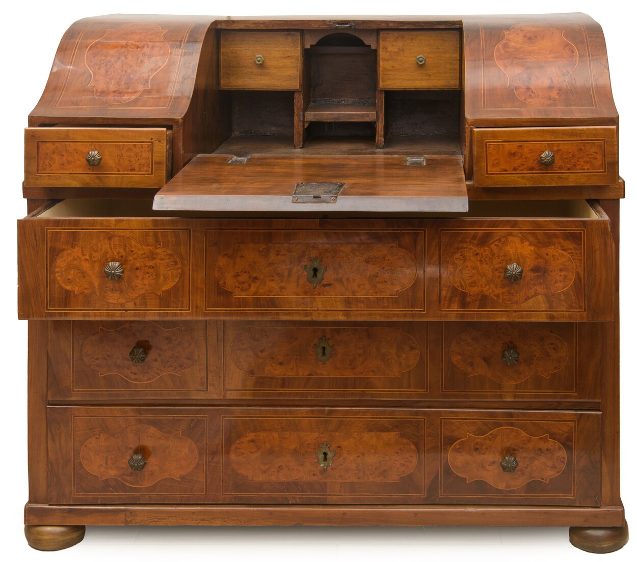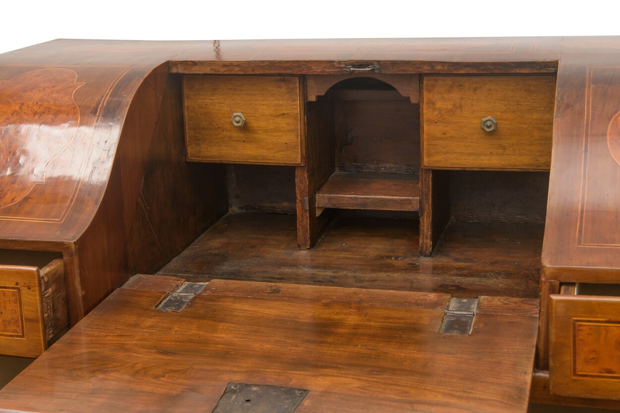 a tre cassetti, coppia di cassettini superiori e cassettiera interna alla calatoia con spallette laterali. In legno di noce, radica di olmo e filettature in legno di bosso.