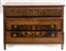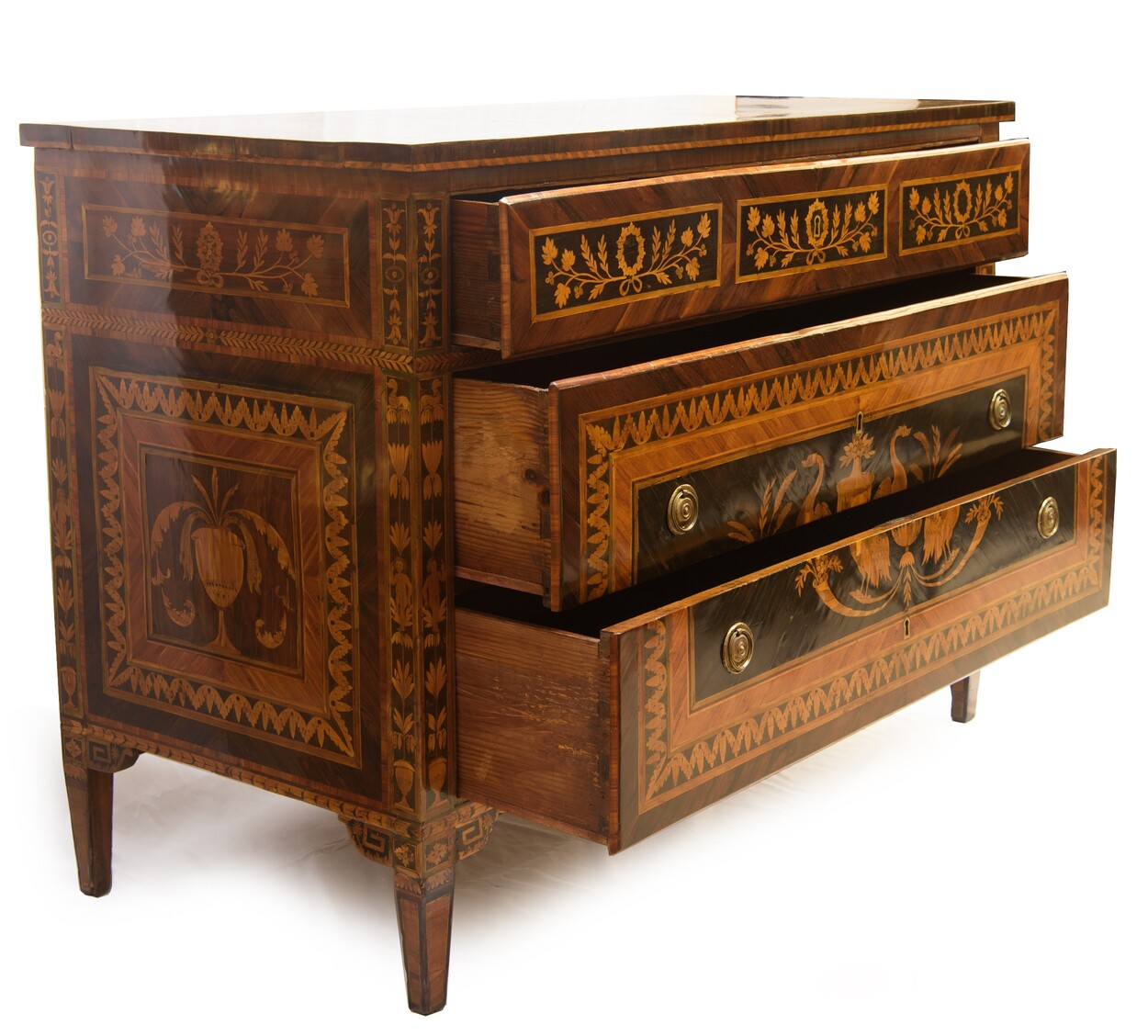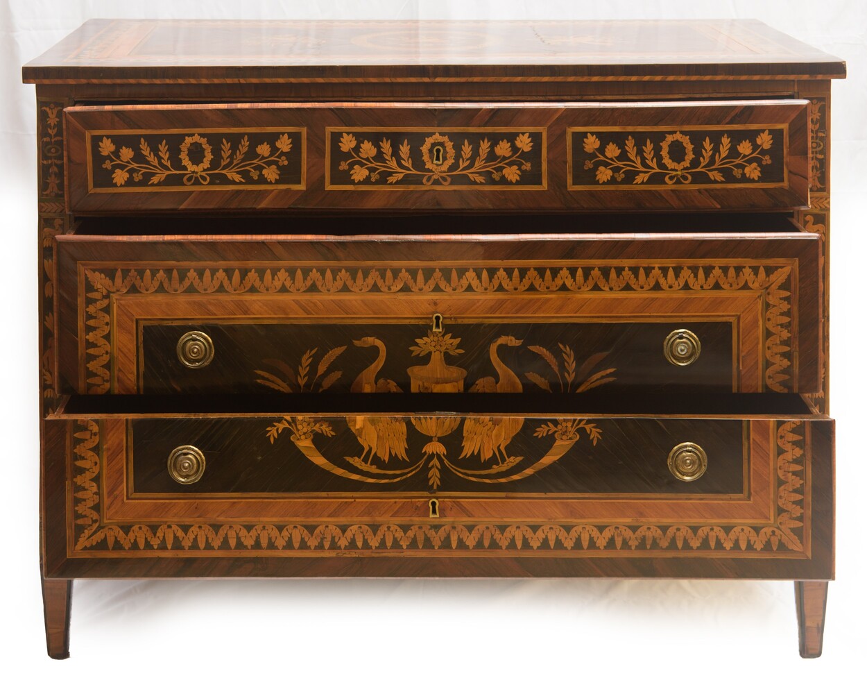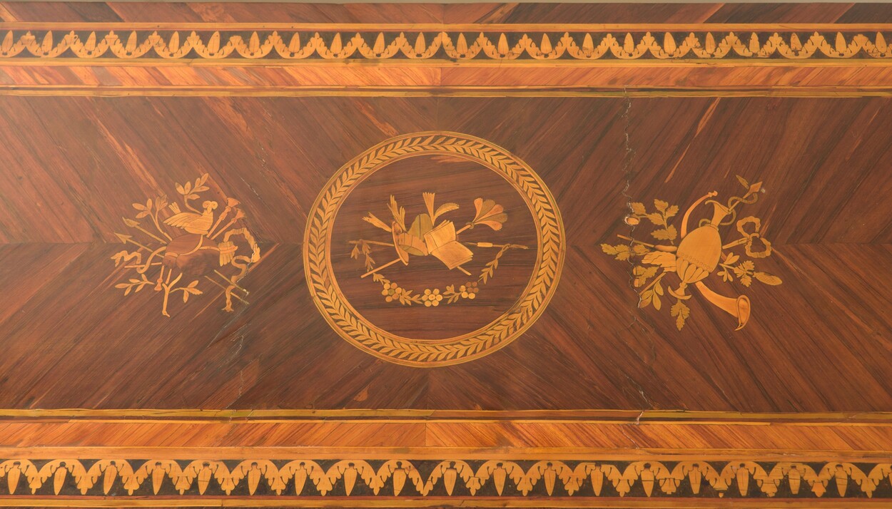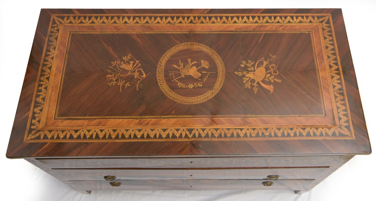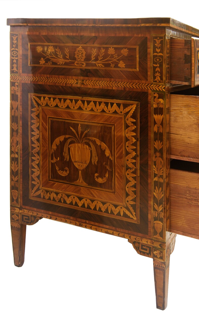 In legno di noce ed ebano rosa, legni vari di frutto e pastiglia. Riccamente intarsiati a motivi floreali e palmette, doppio cassetto senza traversa. Mezzo cassetto superiore. Piano a carattere. Manifattura genovese, Luigi XVI, fine del XVIII secolo.