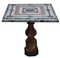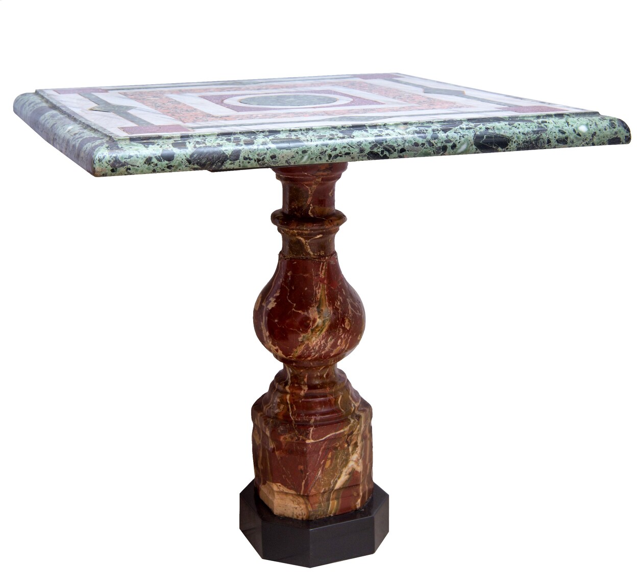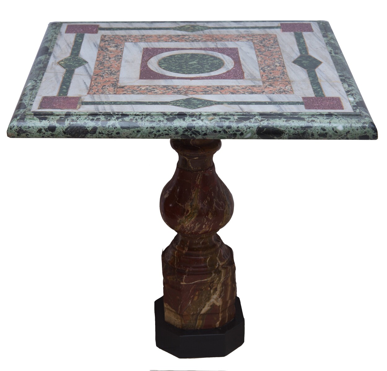Di forma quadrata, con piano lastronato in marmi e pietre dure tra cui porfido verde, porfido rosso, granito rosa e cipollino. Poggiante su piede centrale a balaustro in diaspro di Sicilia, poggiante su plinto in marmo nero del Belgio.