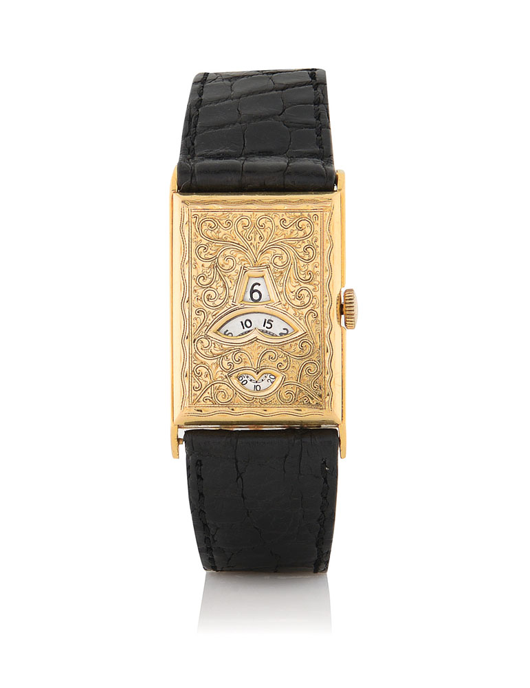 C. rectangular, 18K yellow gold with engraved front, aperture for jumping hour, minute and second. M. rectangular, signed Mimo Watch, manual winding.