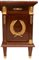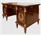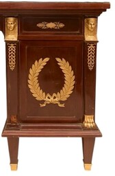in legno di mogano con piano superiore rivestito in pelle, decorazioni in bronzo dorato con cariatidi e piedi felini. Nove cassetti. Di linea Ritorno d'Egitto. Restauri e mancanze