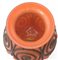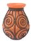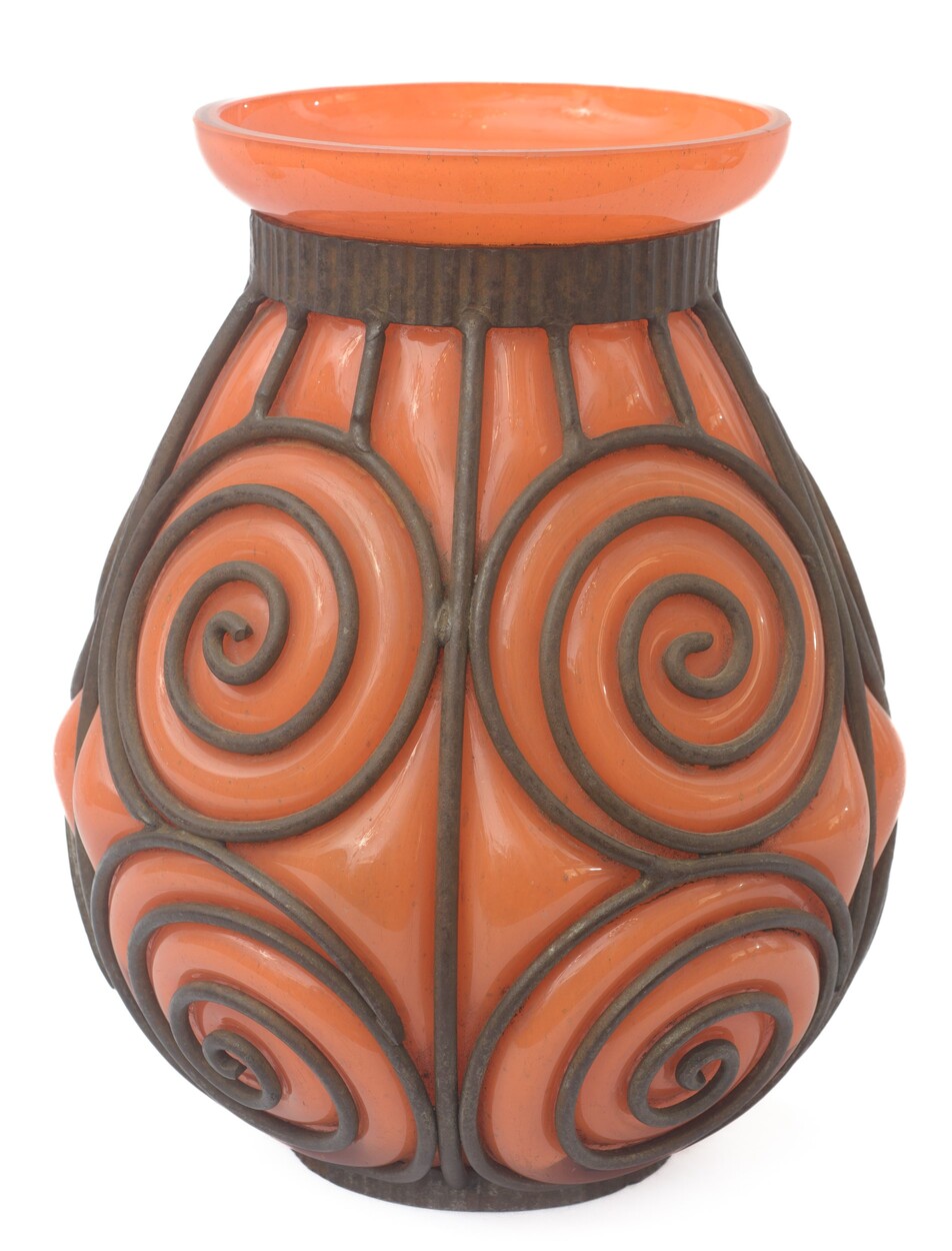 A corpo ovoidale e collo strozzato. Vetro soffiato con sfumature aranciate, entro cornice in ferro battuto con motivo a spirale e scanalature. Firma all'acido al di sotto della base: "L. Majorelle Daum Nancy France".
