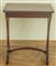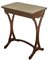 In legno di mogano intagliato e intarsiato in legni di frutto, a comporre decori a racemi. Piedi incrociati raccordati da crociera centrale.