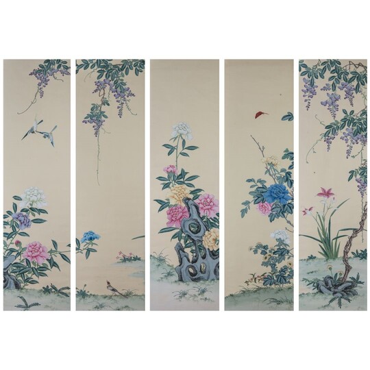 Cinque pannelli prima metà del XX secolo tecnica mista su carta 180 x 51 cm