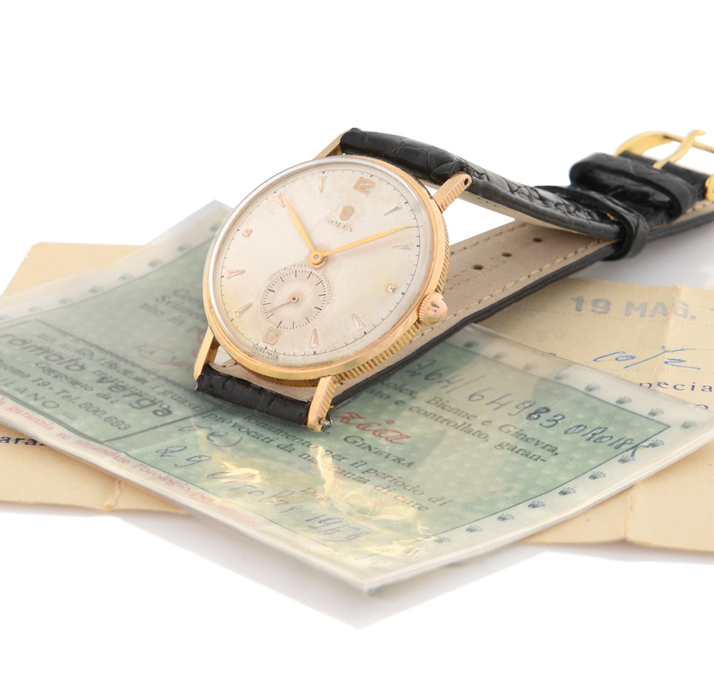 C. 18K pink gold with reeded band and lugs. D. silvered with applied indexes and Arabic numerals, subsidiary seconds. M. manual winding. Dial, case and movement signed. Accompanied by Rolex certificate dated 1959 and service certificate dated 1962.