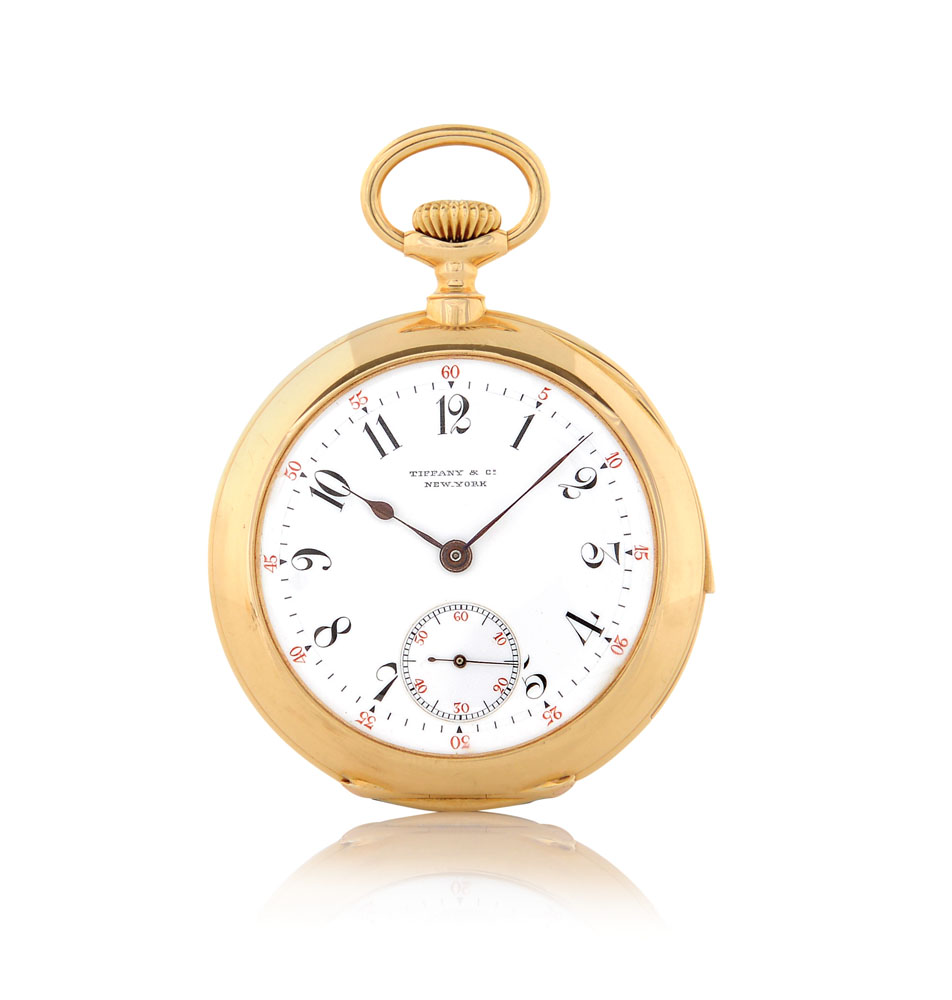 C. openface, 18K yellow gold smooth with blue enamel monogram, engraved inscription dated 1905 on the cover inside. D. white enamel with painted Arabic numerals and red 60 minutes outer division, subsidiary seconds. M. rhodium-finished, minute repeating, keyless dress. Dial, case and movement signed Tiffany & Co. Accompanied by Patek Philippe modern box.