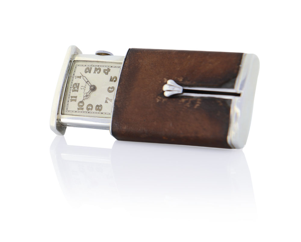 Cassa rettangolare in argento scorrevole entro copricassa in argento e cuoio marrone. Quadrante argentato con numeri arabi luminescenti. Movimento a carica manuale. Quadrante, cassa e movimento firmati.