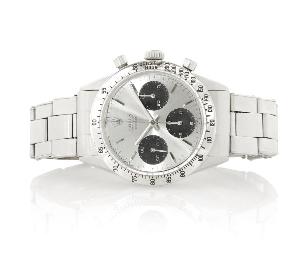 Cassa n. 2526273 in acciaio con fondello e corona a vite, pulsanti tondi e lunetta con scala tachimetrica smaltata. Quadrante bicolore argentato e nero con indici applicati, contatore a 30 minuti e 12 ore. Movimento cal. 727 a carica manuale. Bracciale Oyster in acciaio a maglie estensibili. Quadrante, cassa, movimento e bracciale firmati.