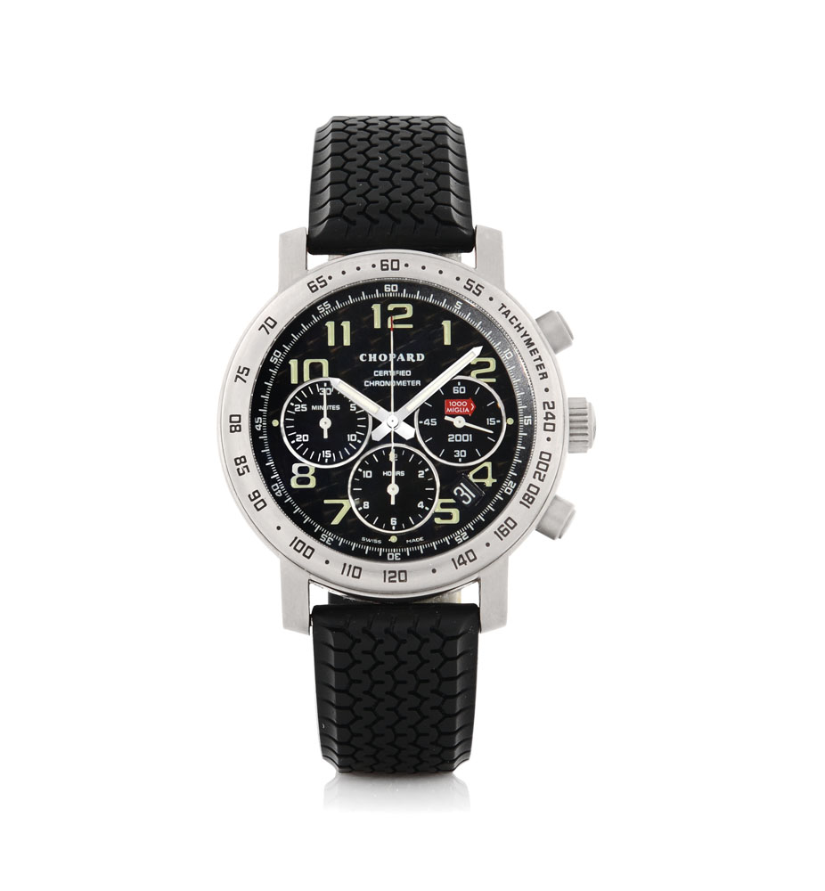 C. titanium with transparent case back secured by screws, round buttons and bezel with tachymetre scale. D. black with luminous indexes and hands, 30 minute and 12 hour registers, date between 4 and 5. M. self-winding. Dial, case and movement signed. Accompanied by Chopard rubber strap and titanium buckle.