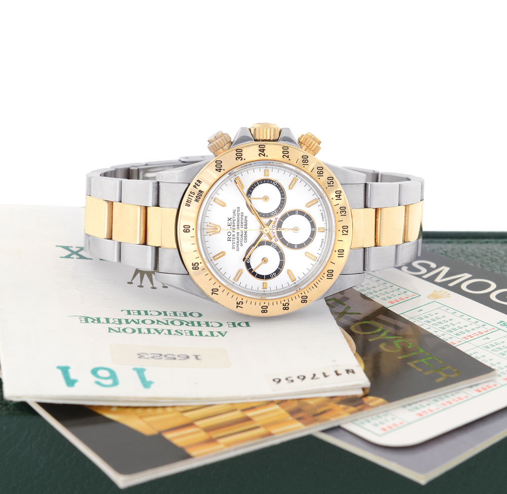 Cassa n. N117656 in acciaio e oro giallo 18 kt con fondello, corona e pulsanti a vite, lunetta con scala tachimetrica smaltata e vetro zaffiro. Quadrante bicolore bianco e nero con indici applicati, contatore a 30 minuti e 12 ore. Movimento a carica automatica. Bracciale Oyster Fliplock in acciaio e oro giallo 18 kt. Quadrante, cassa, movimento e bracciale firmati. Completo di astuccio e certificato del 12/1992.