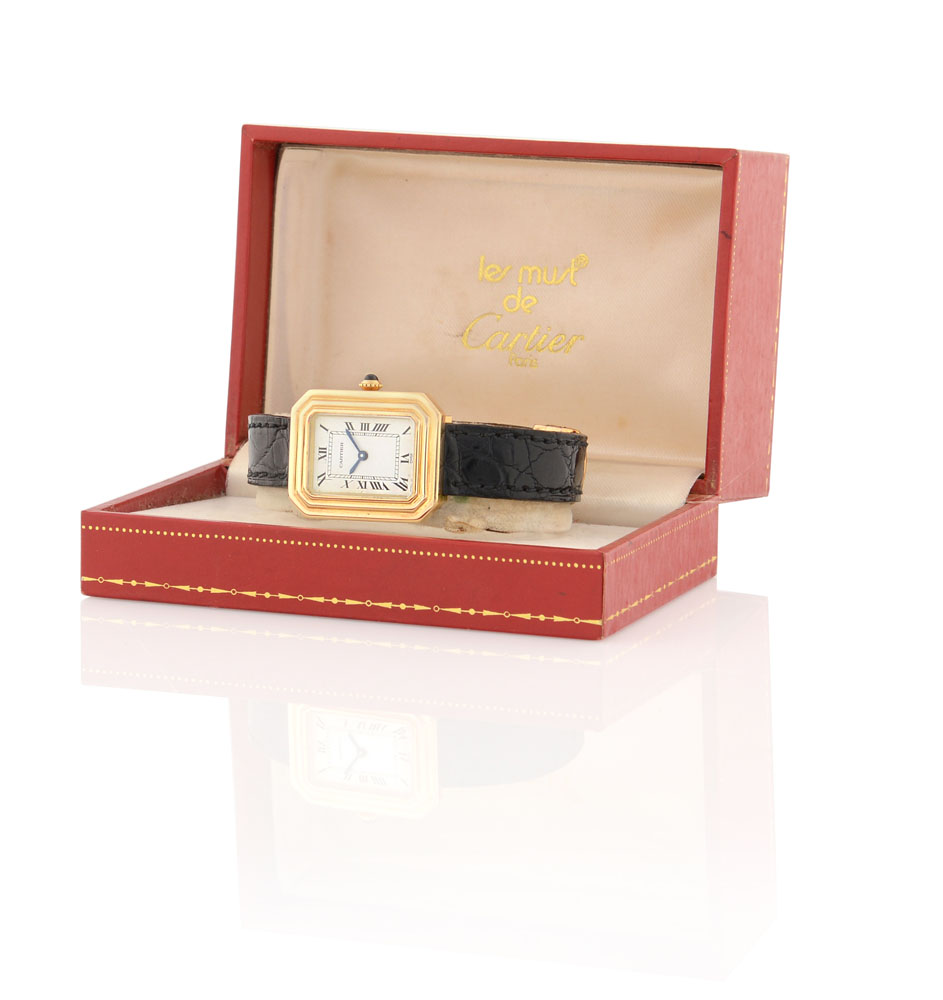 C. octagonal-shaped, 18K yellow gold with case back secured by screws. D. white with painted Roman numerals. M. manual winding. Dial, case and movement signed. Accompanied by Cartier 18K yellow gold deployant clasp.