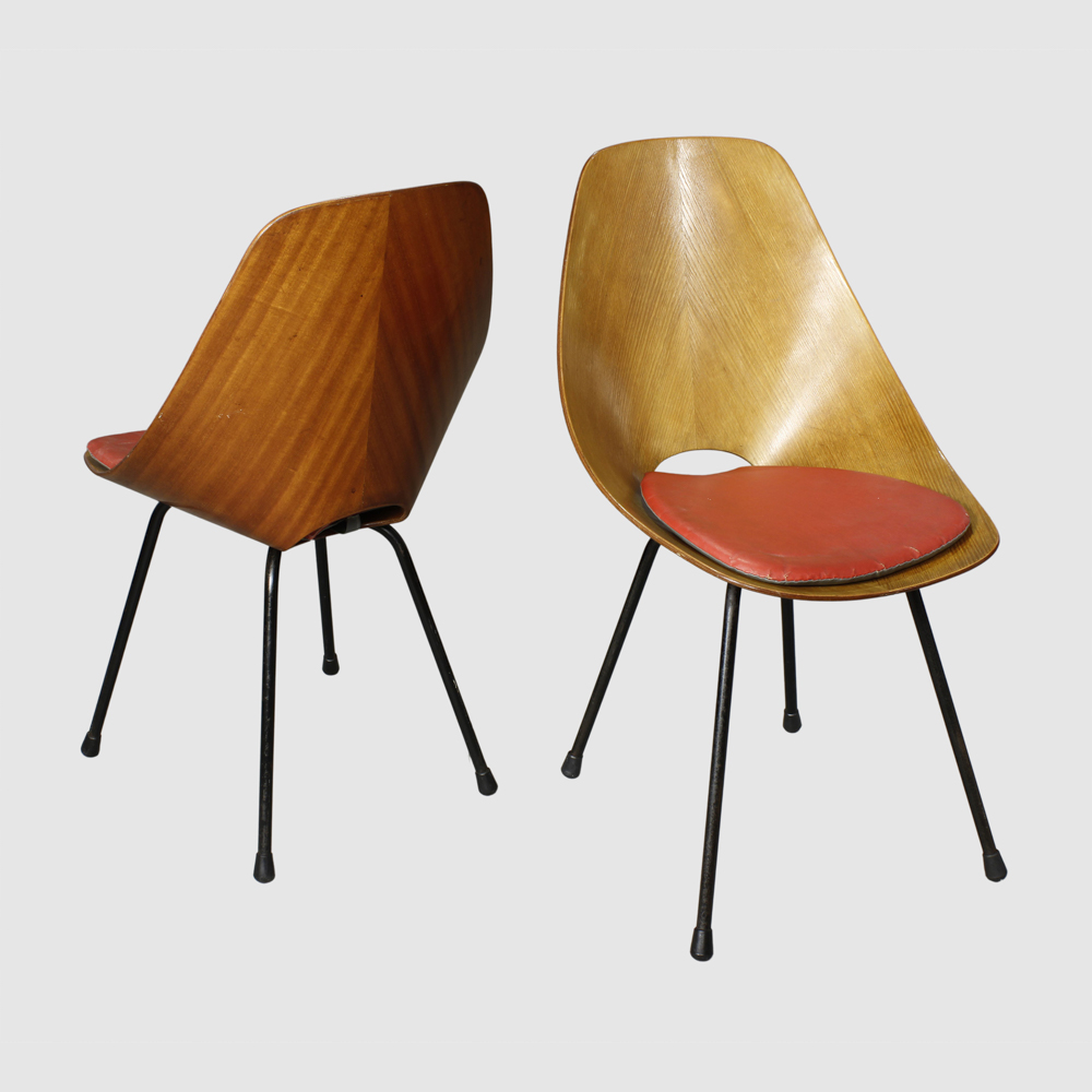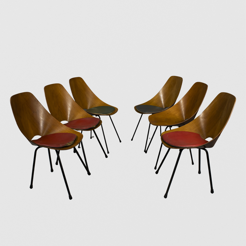 Vittorio Nobili, prod. Fratelli Tagliabue (6)Italia, 195582x46x55 cm.sei sedie mod. Medea in metallo e legno, marchio della produzione, lievi difetti.