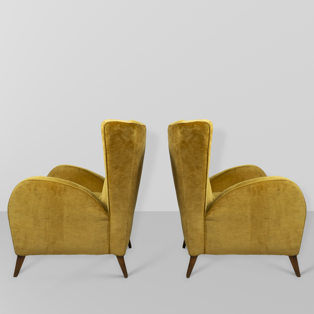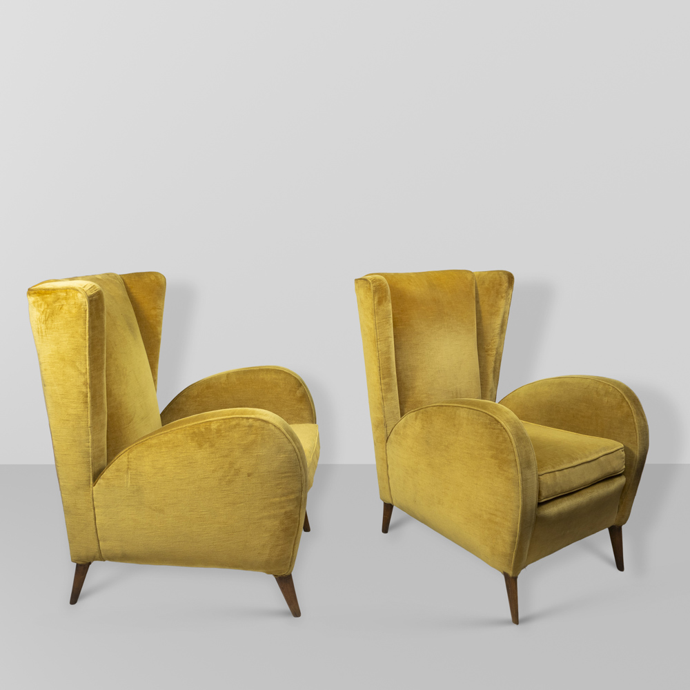 Paolo Buffa, attribuito (2)Italia, anni 50100x75x76 cm.coppia di poltrone in legno e tessuto imbottito, lievi difetti