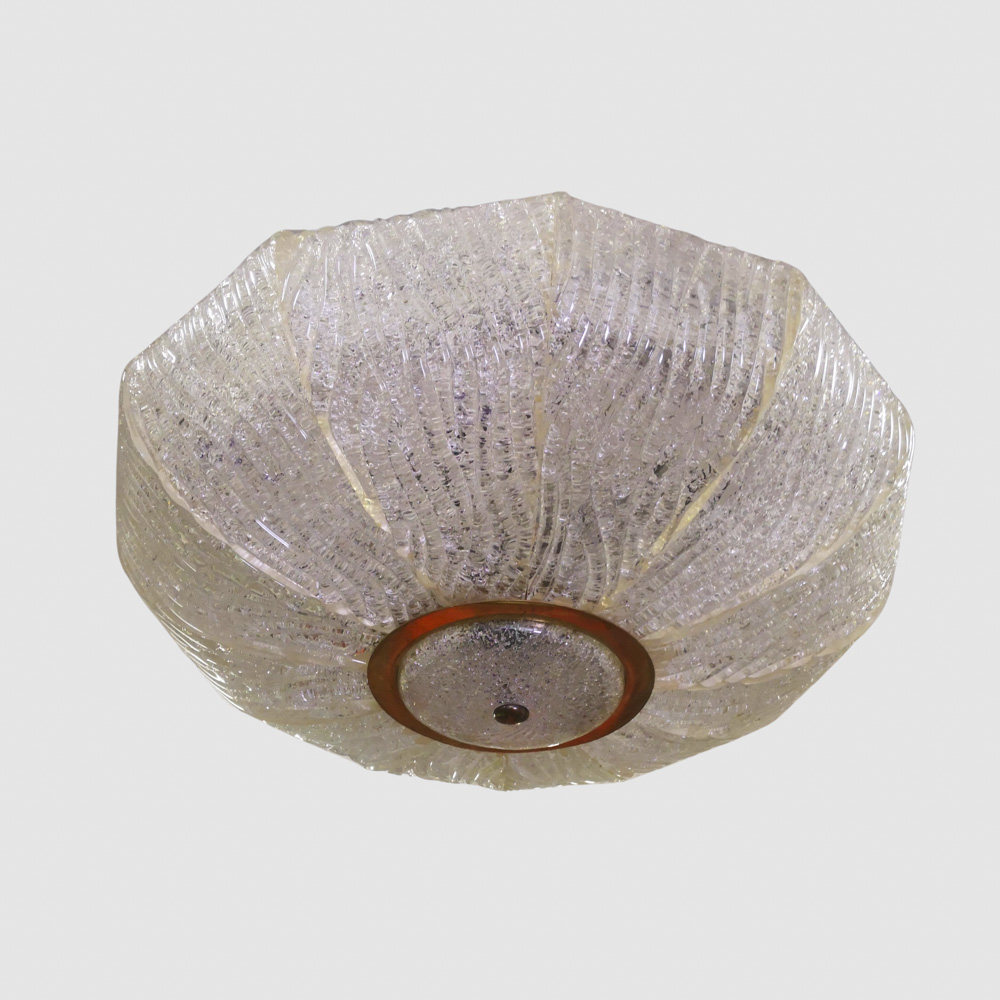 Prod. VeniniMurano, anni 50-60d. 60 cm.lampada da soffitto in vetro corteccia ed ottone, marchio della produzione