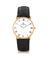 C. 18K yellow gold. D. white with painted Roman numerals. M. manual winding. Dial, case and movement signed. Accompanied by Jaeger le Coultre buckle.