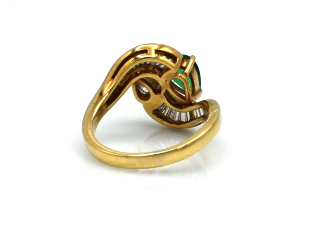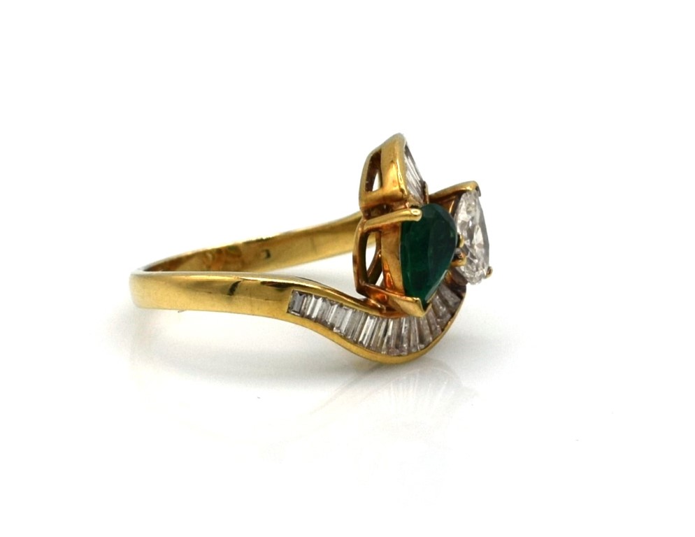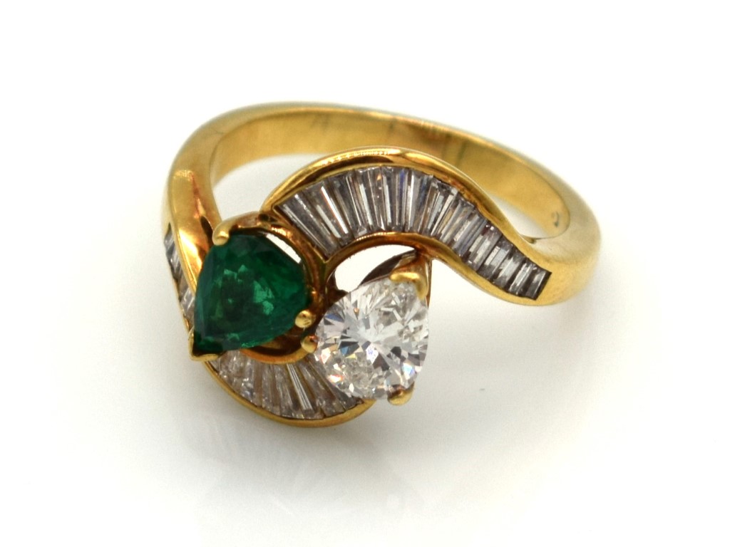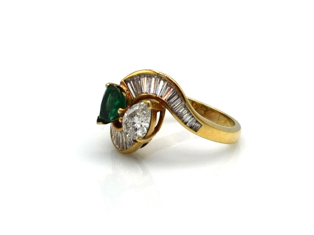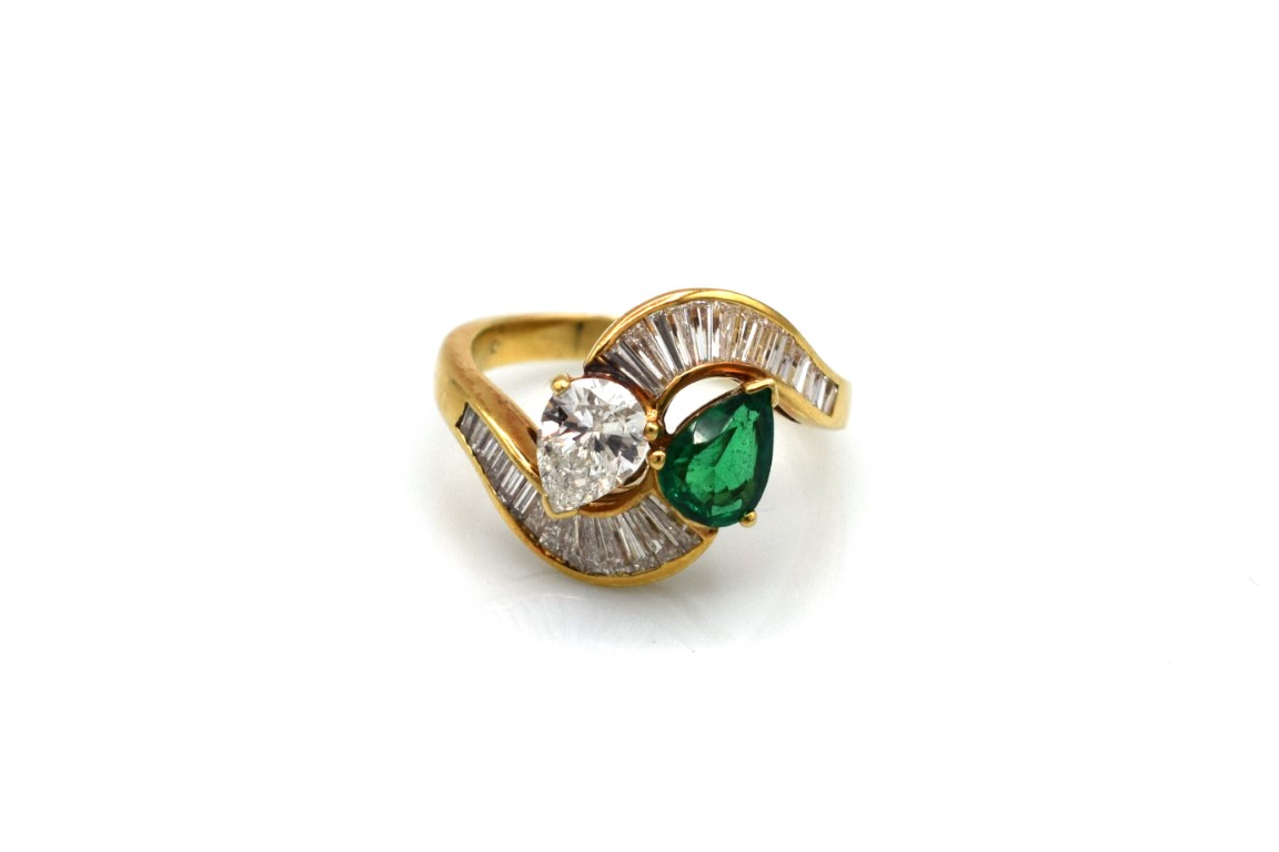 Smeraldo a goccia 7.30x5.50 mm e diamante a goccia 7.20x5.40 mm 1ct circa stimato e diamanti taglio trapezio per un totale di 0.70ct circa stimati.