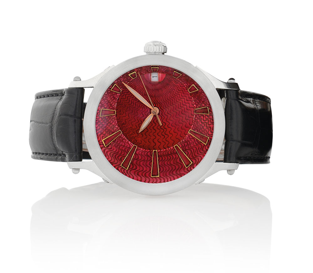 Cassa in acciaio con oblò decentrato sul fondello chiuso da viti, vetri zaffiro. Quadrante in smalto rosso con indici applicati in oro e smalto rosso, secondi al centro e data al 3. Movimento a carica automatica. Quadrante, cassa, vetro e movimento firmati. Completo di cinturino e fibbia double deployante in acciaio originali, astuccio e certificato