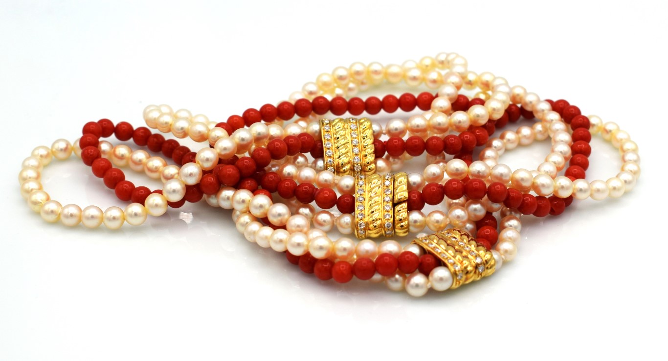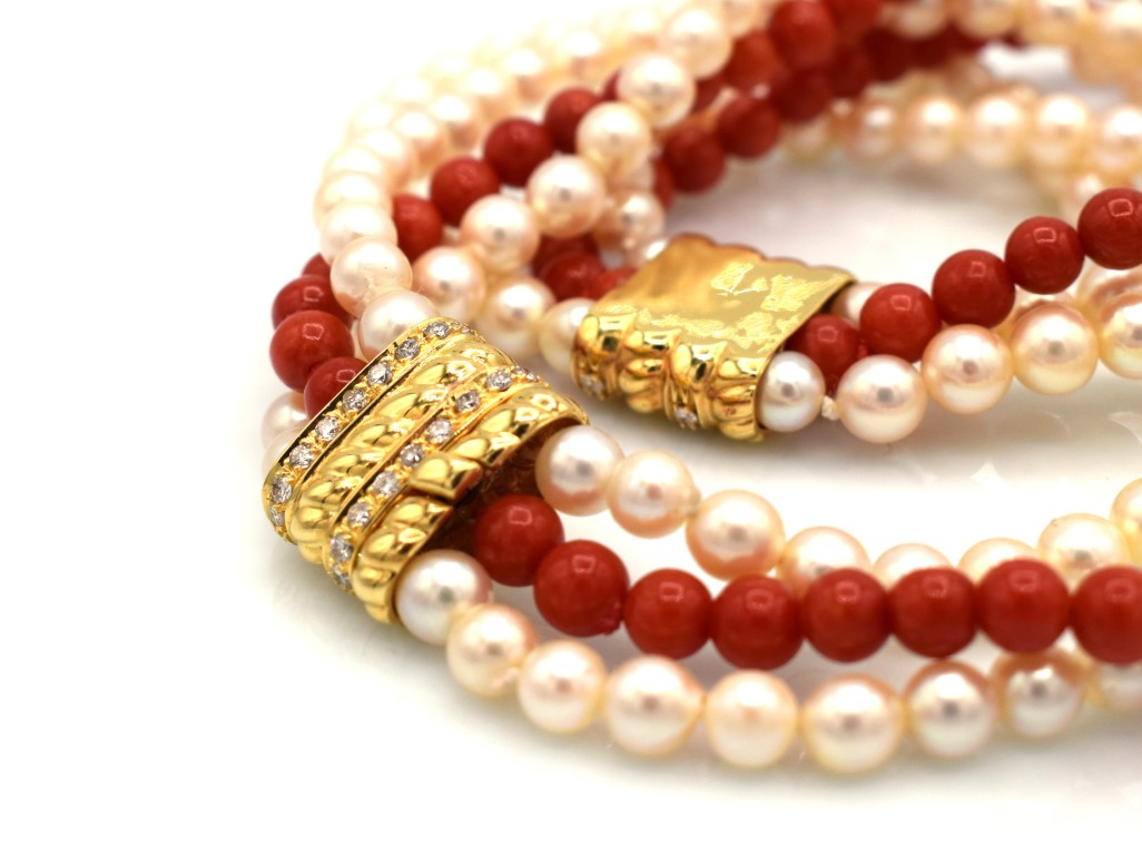 Tre fili: due fili di perle diametro 7mm e un filo in corallo diametro 6.5 mm. Elementi in oro 750 e diamanti taglio brillante per un totale di 0.90 ct stimati. Bollo 750.