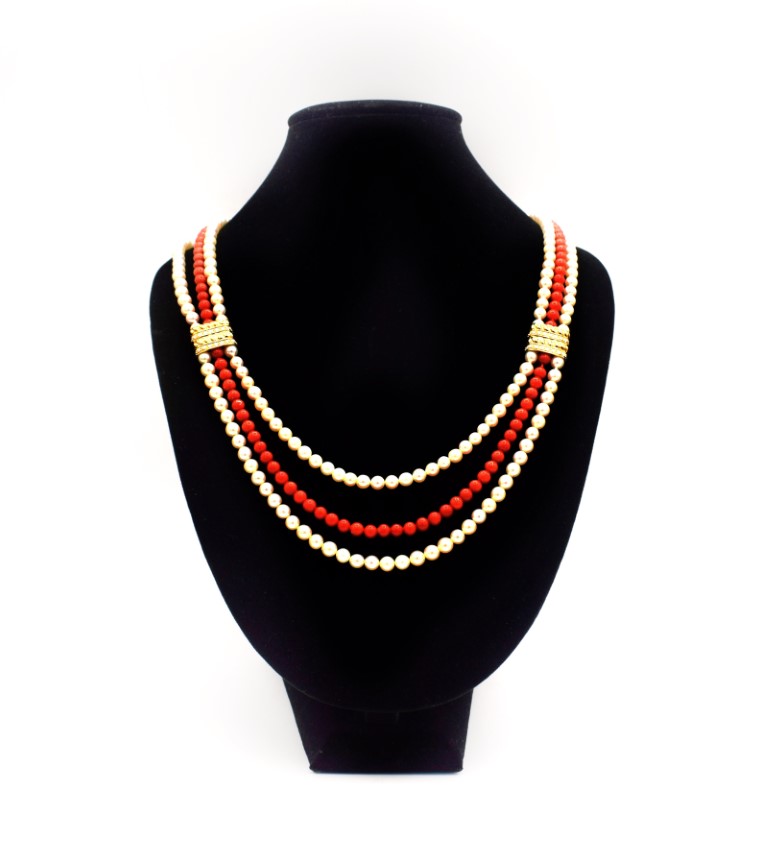 Collana a tre fili di perle e corallo