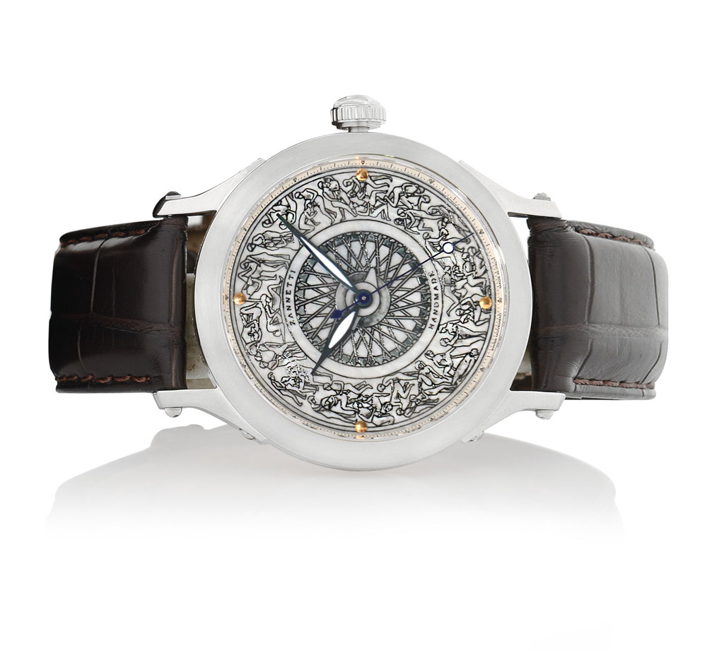 C. stainless steel with transparent case back secured by screws, sapphire crystals. D. engraved with little stylized figures representing the erotic theme, applied indexes, luminous hands, centre seconds and date at 3. M. self-winding. Dial, case, crystal and movement signed. Accompanied by Zannetti Roma strap and stainless steel double deployant clasp, box and certificate.