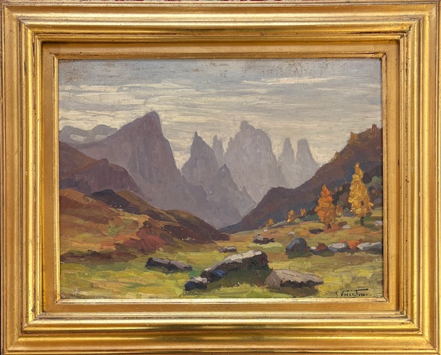 Luigi Vicentini Pomarolo (TN) 1901 - 1970 Nomi (TN) Le Dolomiti Olio su cartone cm 33,5x45 firmato in basso a sx