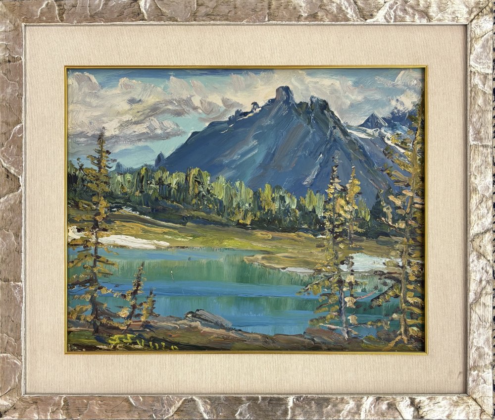 Paolo Punzo Bergamo 1906-1979 Paesaggio montano con lago Olio su tavola cm 38x48 firmato in basso a sx
