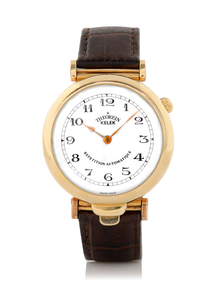 C. gold plated with transparent case back, mobile lugs, crown at 2 and button at 6. D. white with painted Arabic numerals. M. self-winding, hours and 5 minutes repeating. Dial and movement signed, case numbered.