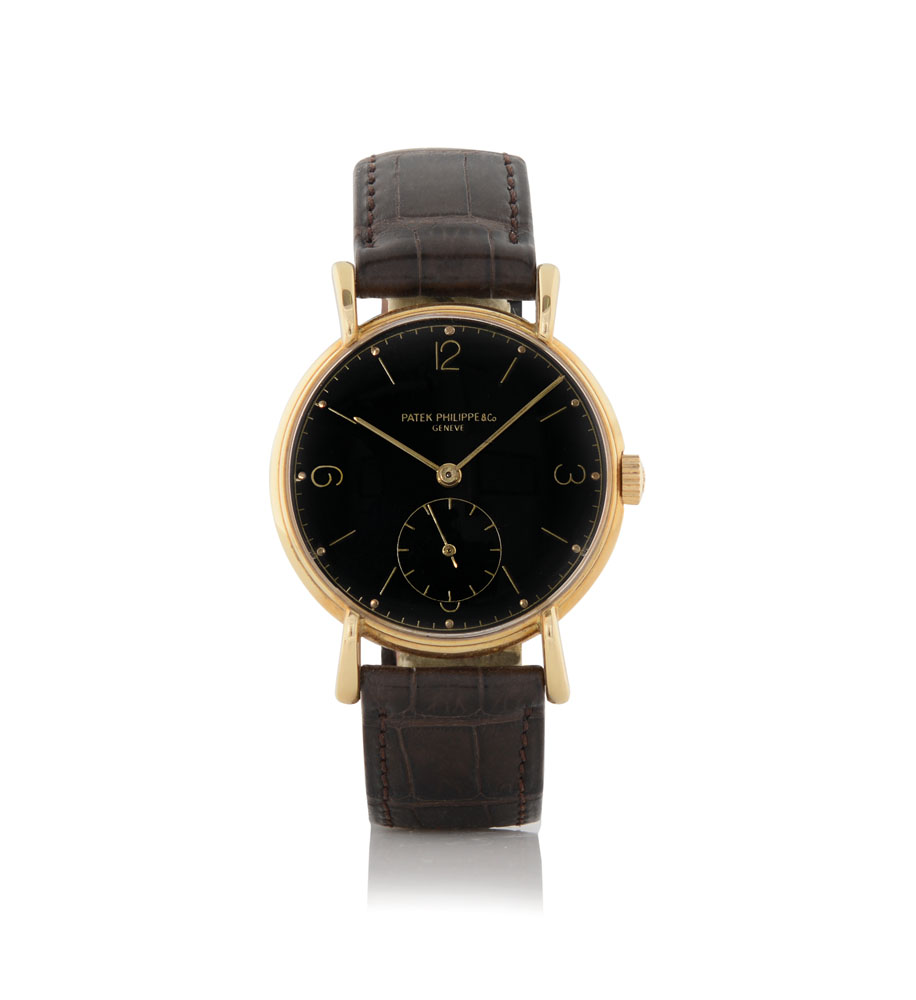 C. 18K yellow gold with teardrop lugs. D. black with painted indexes and Arabic numerals, subsidiary seconds and applied spot indexes (reprinted). M. manual winding. Dial , case and movement signed. Accompanied by Patek Philippe 18K yellow gold buckle and modern box.