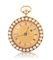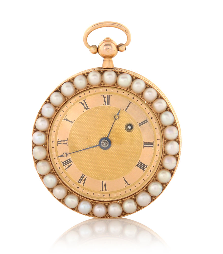 Cassa in oro giallo 18 kt incisa guillochè con profili in perle e carrura godronata. Quadrante in oro inciso guillochè al centro con numeri romani smaltati. Movimento con scappamento a verga, carica a chiavetta.
