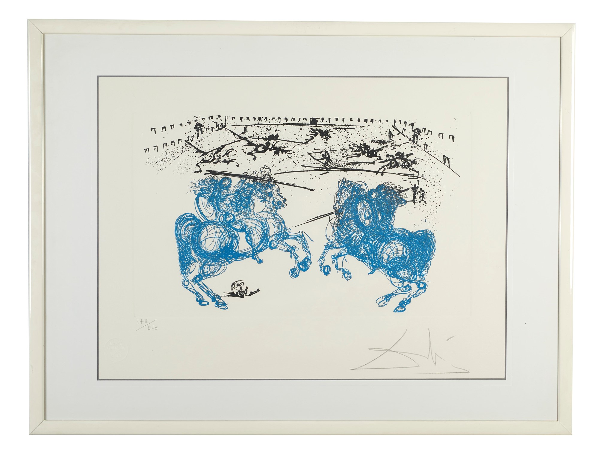 SALVADOR DALI’ (Figueres 1904 - 1989) “Combate de cavalleros”, 1973. Acquaforte e acquatinta su carta. Cm 56x76. Opera firmata in basso a destra Dalì. Reca numeri di tiratura in basso a sinistra 17/75. Al retro reca certificato di autenticità Grupo Quince Madrid España.