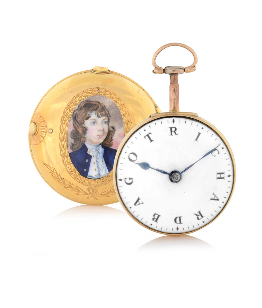 C. openface, 18K yellow gold smooth with 18K yellow dust cover with miniature depicting gentlemen into engraved frame. D. white enamel with letters "Richard Bagot" as numerals. M. verge escapement, key winding. Movement signed and numbered.