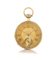Cassa massiccia in oro giallo 18 kt con profili sbalzati e carrura incisa guilloché. Quadrante in oro giallo con decori a tre colori periferici, numeri Romani applicati, secondi al 6. Movimento firmato con scappamento a verga, suoneria a richiamo delle ore e dei quarti, carica a chiavetta.