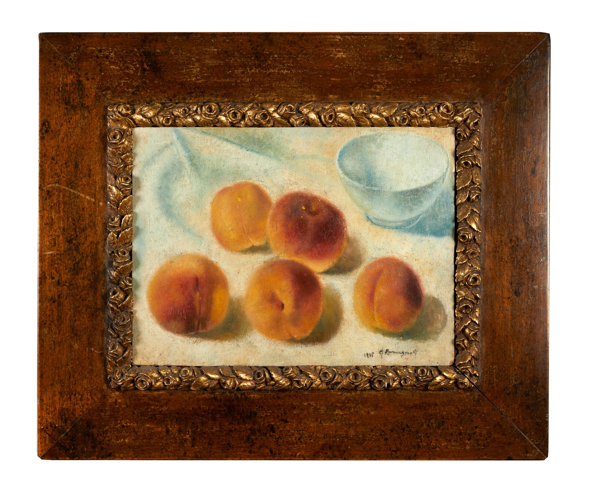 GIOVANNI ROMAGNOLI (Faenza 1893 – Bologna 1976), “Natura morta”, 1935. Olio su tavola. Cm 31x41,5. Opera firmata e datata in basso a destra G. Romagnoli 1935. Al retro reca etichetta riportante scritta Professor Giovanni Romagnoli, Natura Morta, Bologna.