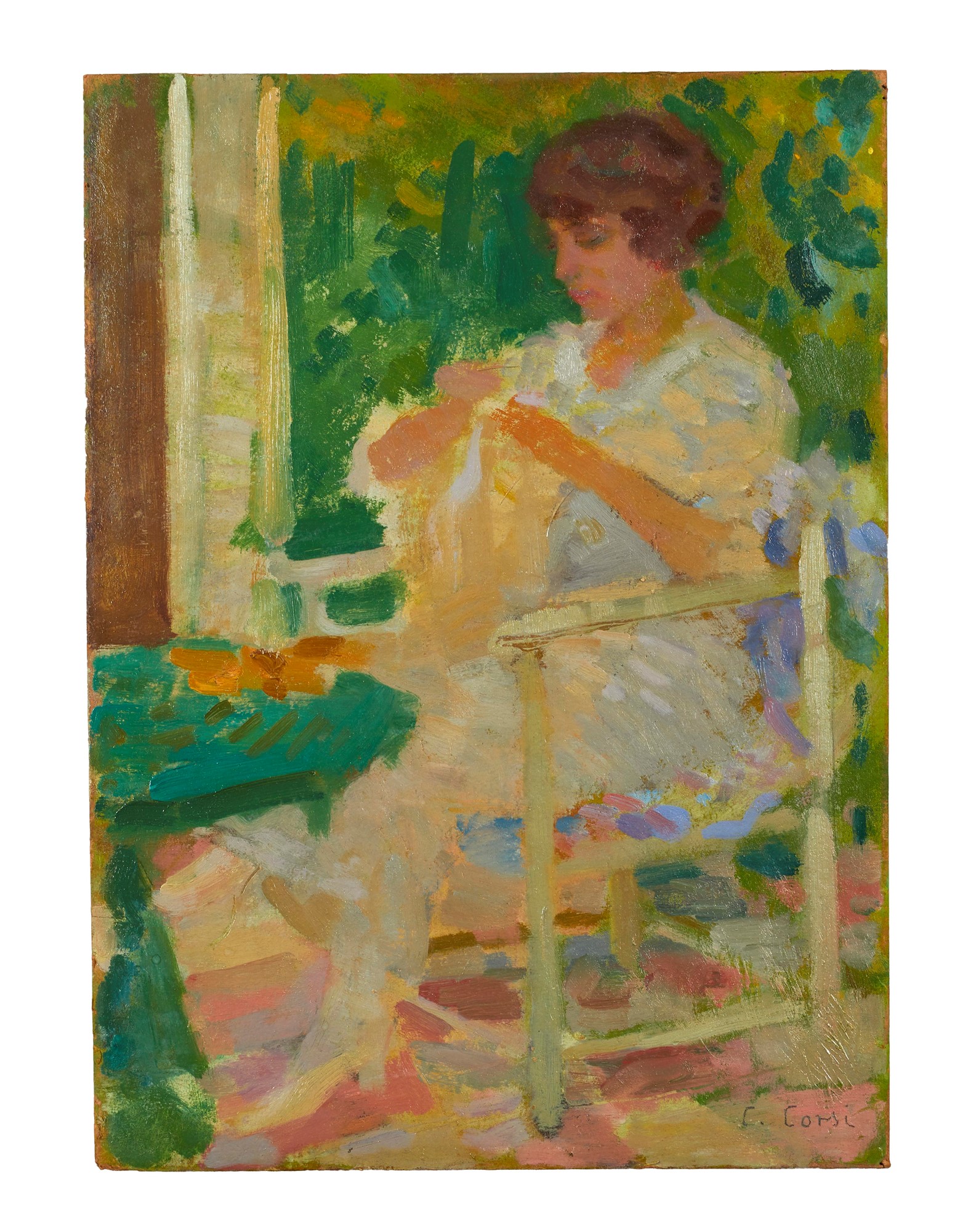 CARLO CORSI (Nizza 1879 – Bologna 1966), “Donna che cuce”, 1911 -1912. Olio su cartone. Cm 47x34. Opera firmata in basso a destra C. Corsi.
