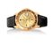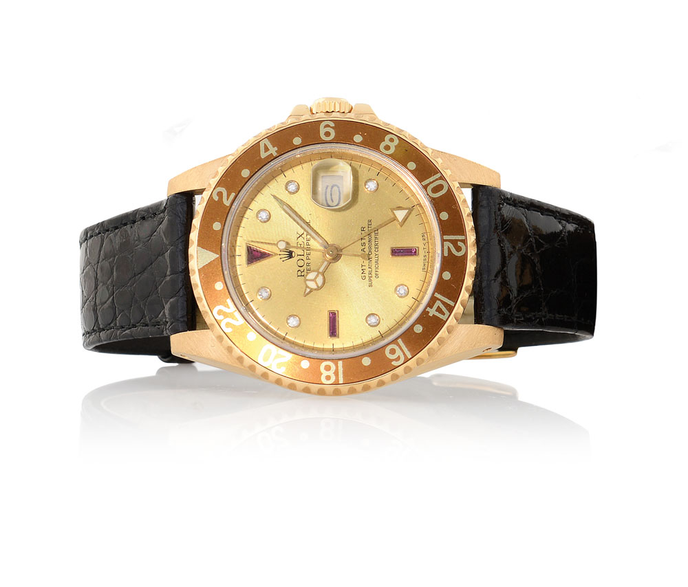 C. 18K yellow gold with screwed case back and crown, brown revolving bezel with 24 hours and sapphire crystal. D. champagne with diamond and rubies indexes, luminous hands, centre seconds and central hand for second time zone, date at 3. M. self-winding. Dial, case and movement signed. Accompanied by Rolex strap and buckle.