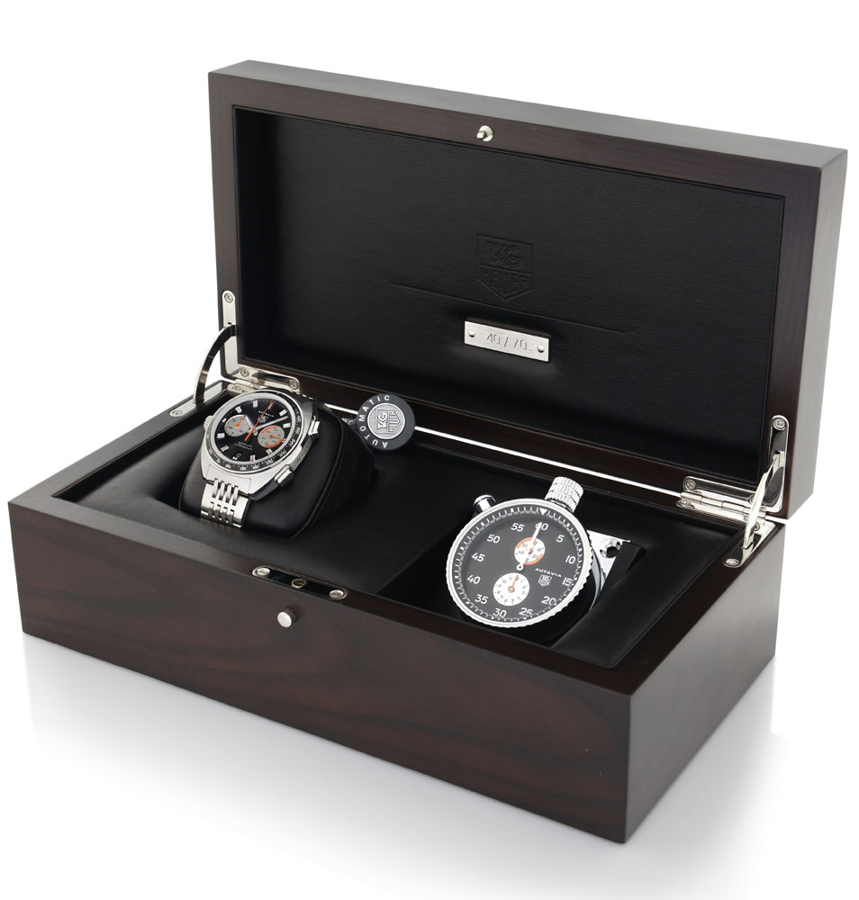 Cassa tonneau con fondello chiuso da viti, pulsanti rettangolari e lunetta nera con scala tachimetrica. Quadrante bicolore nero e bianco con indici applicati, lancette luminescenti, contatore a 30 minuti e data al 6. Movimento a carica automatica. Bracciale in acciaio con chiusura a scomparsa. Quadrante, cassa, movimento e bracciale firmati. Completo di cofanetto originale numerato, cronometro da cruscotto, certificato originale.