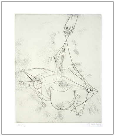 MARINO MARINI Pistoia 1901 – Viareggio 1980 Immaginazione 1970 Acquaforte es.53/60. Firma in b. a d.; in b. a s. timbro a secco Luigi De Tullio Stampatore. (50,5 x 37,7 foglio – 40,5 x 32,5 inc.) Tiratura: 60 es. num. arabi + XX es. num. romani + 5 es. fuori commercio in lettera dalla A alla E. L'opera fa parte dell'album "Marino Marini Opera Grafica" edito e stampato da Luigi De Tullio, Milano, 1972. Pubbl. : “Marino Marini Catalogo ragionato dell’Opera grafica (Incisioni e Litografie) 1919-1980” a cura di Giorgio e Guido Guastalla, Edizioni Graphis Arte, Livorno, 1990, p.213, A 118.