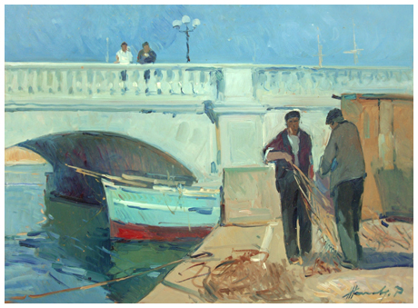 PIERO MARCHI Borgo San Lorenzo 1917 – Livorno 2002 Darsena Olio su faesite 35 x 50. Firma in b. a d.; sul verso titolo e firma.