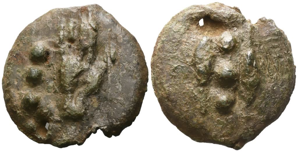 Mint: Rome. Right hand; three pellets (mark of value) to l.; Rv. Two barley grains; three pellets (mark of value) between. Crawford 14/4; ICC 29; HN Italy 271; RBW 5. Brownish green patina. Very fine. Untouched.