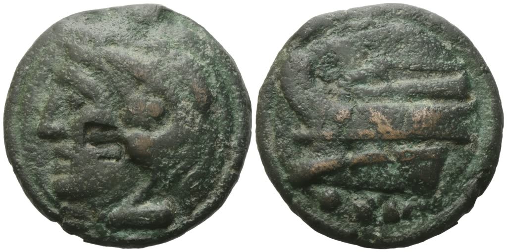 Libral standard. Rome, circa 225-217 BC. Head of Hercules l., wearing lion skin headdress; Rv. Prow to l.; three pellets (mark of value) below. Crawford 36/4; Haeberlin pl. 22, 15; HN Italy 340; ICC 91. Appealing dark green patina. Good very fine.