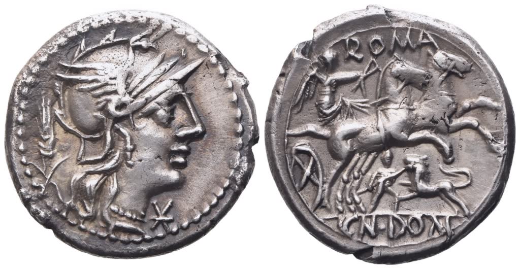 Head of Roma to r., wearing winged helmet; behind, grain ear; before, * (mark of value); Victory in biga to r., holding whip in her right hand and reins in her left; above, ROMA; below, man fighting lion; in exergue, CN·DOM. Crawford 261/1; Babelon (Domitia) 14; Sydenham 514. Wonderful old cabinet tone. Extremely fine/near extremely fine.