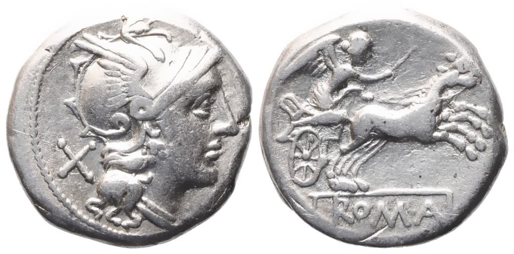 Helmeted head of Roma right; X (mark of value) behind; Rv. Victory driving biga r. Crawford 198/1; Debernardi D1a. Good very fine. Lustrous metal.