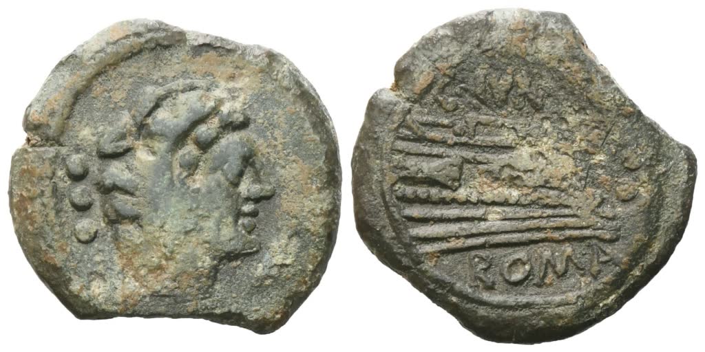Head of Hercules r.; three pellets (mark of value) behind; Rv.Prow of galley r.; before, three pellets (mark of value). Crawford 210/5; RBW 898. Lovely light brownish-green patina. Very fine. Very rare.