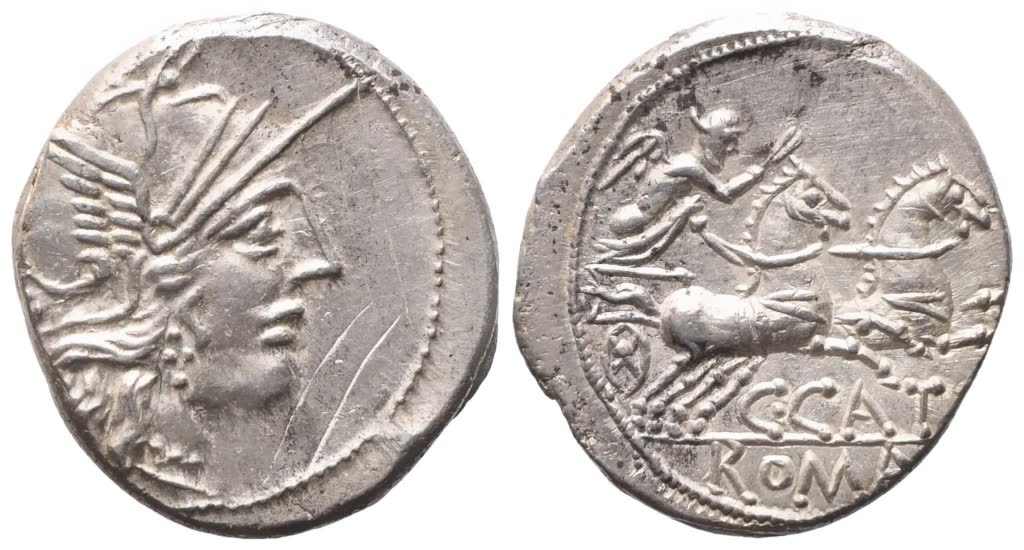 Helmeted head of Roma r.; [X (mark of value)] to l.; Rv. Victory driving galloping biga right, holding reins and whip; below, C·CATO; in exergue, ROMA. Crawford 274/1; Babelon (Porcia) 1; Sydenham 417. A couple of scratches on the obverse; reverse slightly off-centre, otherwise good very fine / about extremely fine.