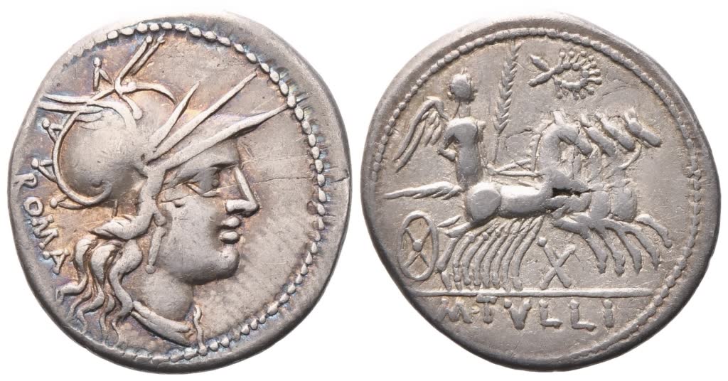 Helmeted head of Roma r., ROMA behind; Rv. Victory in quadriga right, holding reins and palm branch; X (mark of value) below horses, wreath above, M TVLLI in exergue. Crawford 280/1; Babelon (Tullia) 1; Sydenham 531. Appealing iridescence. Good very fine.